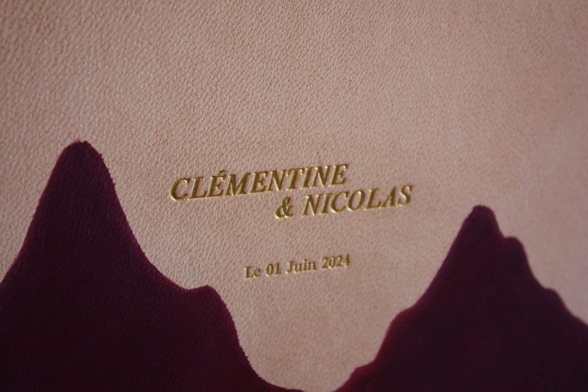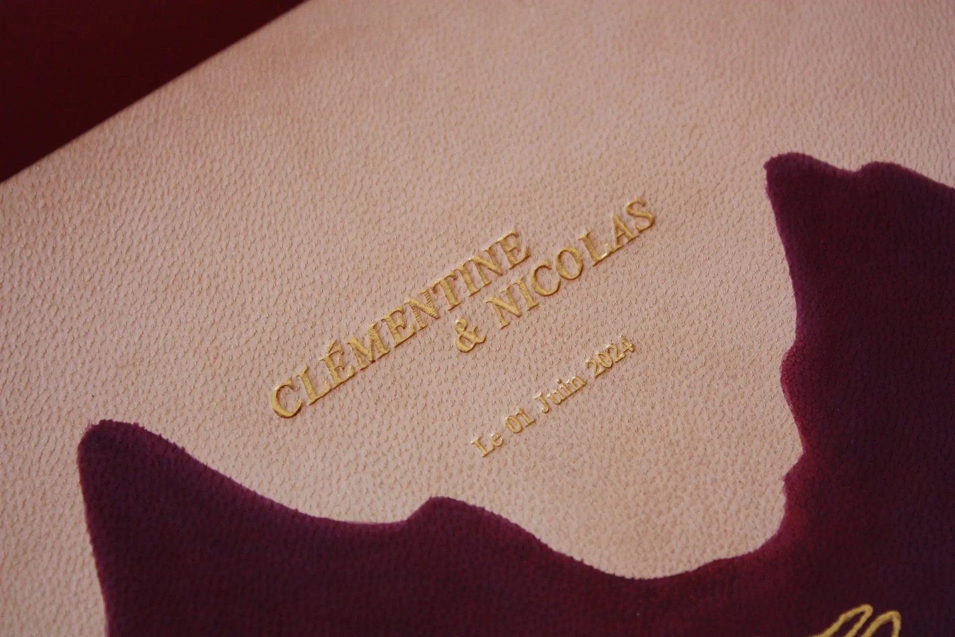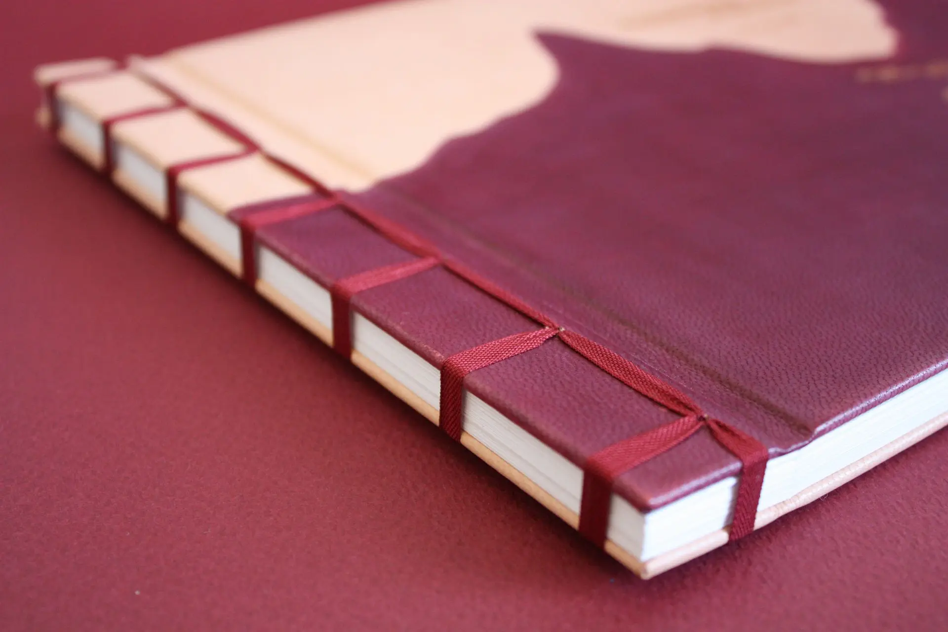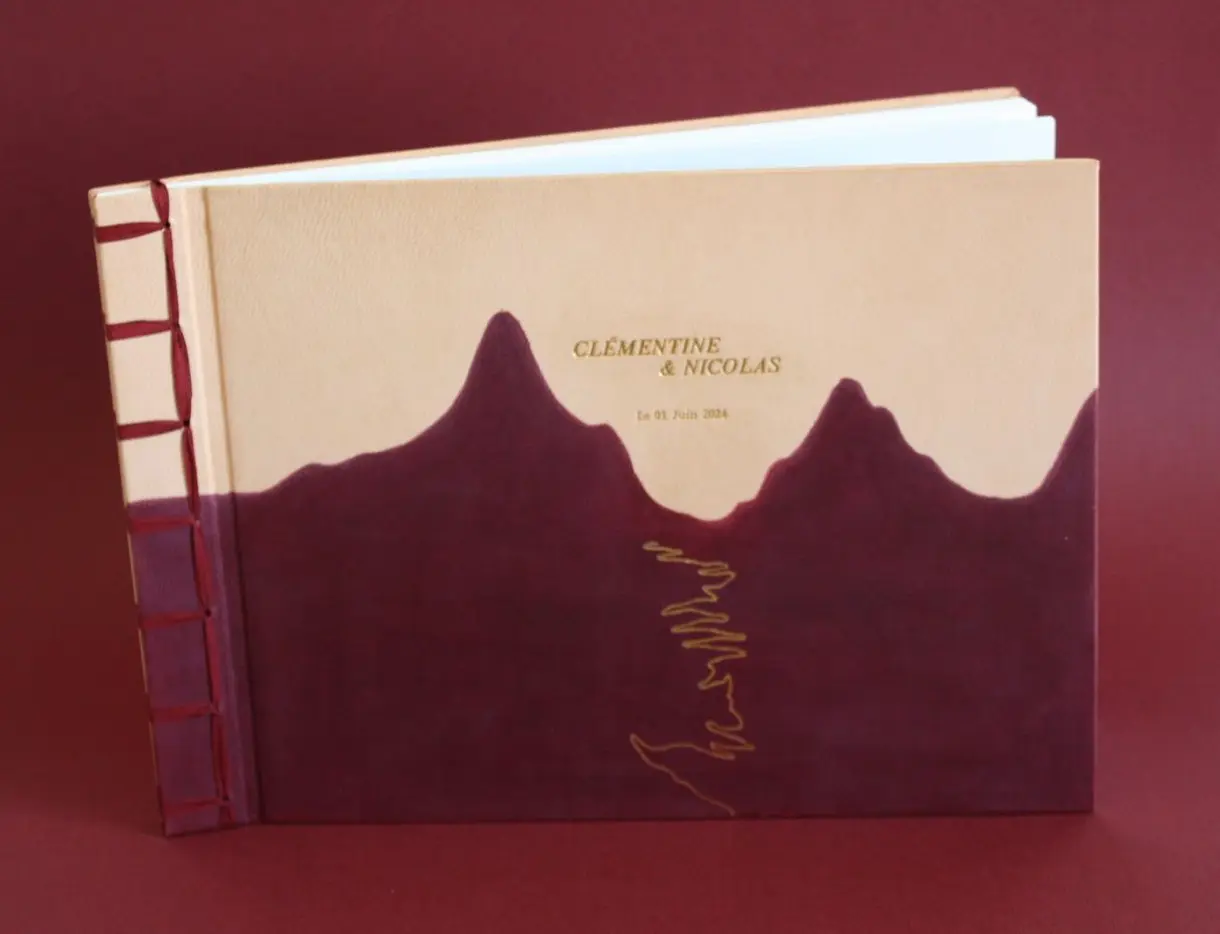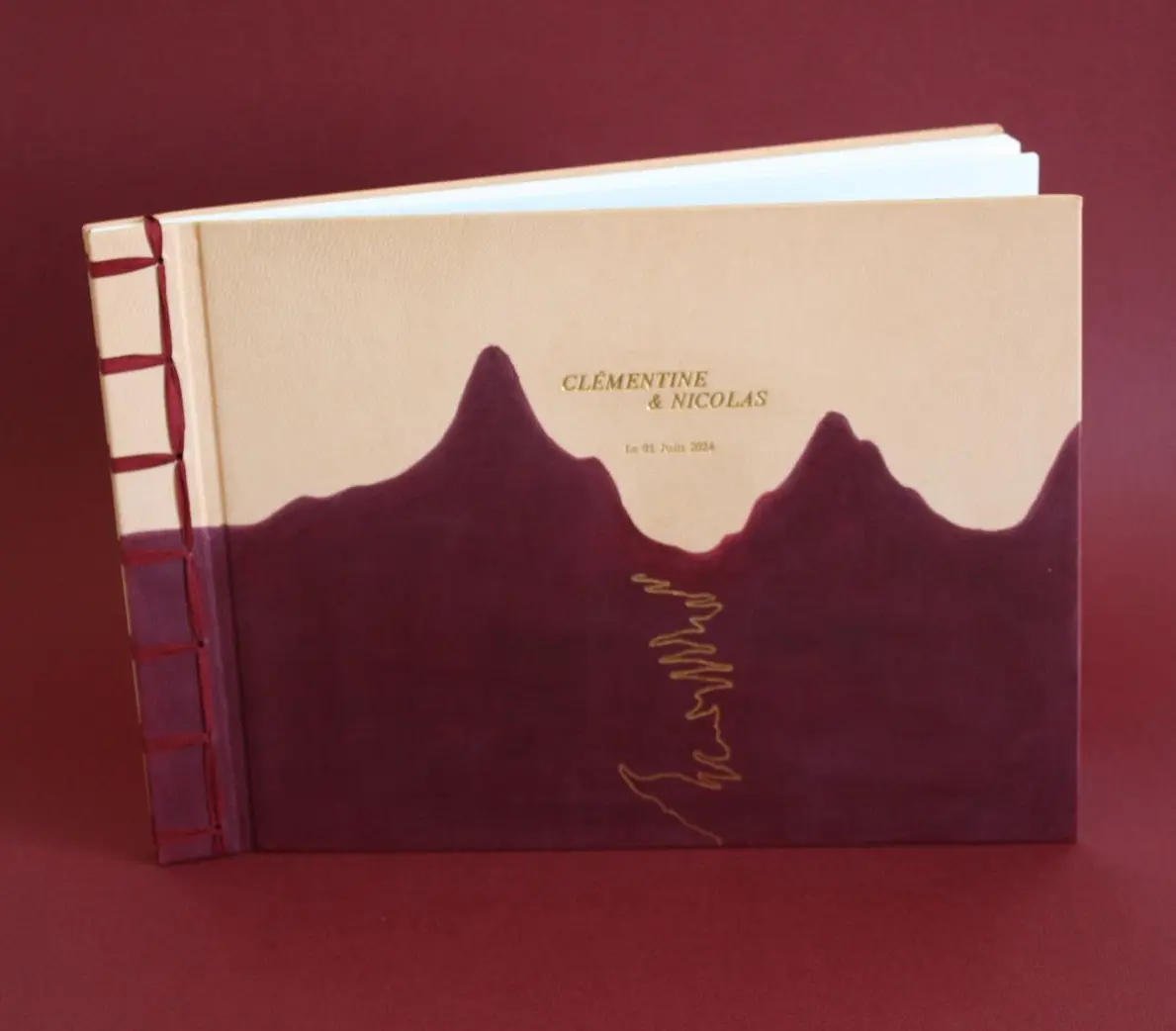 Reliure Japonaise en plein cuir de chèvre beige clair. Décor à la teinture pour cuir bordeaux représentant les montagnes de l'Alpe d'Huez. Rehaut de dorure à chaud représentant le parcours cycliste de la même étape. Texte doré à chaud. Livre d'or de mariage réalisé en 2024.