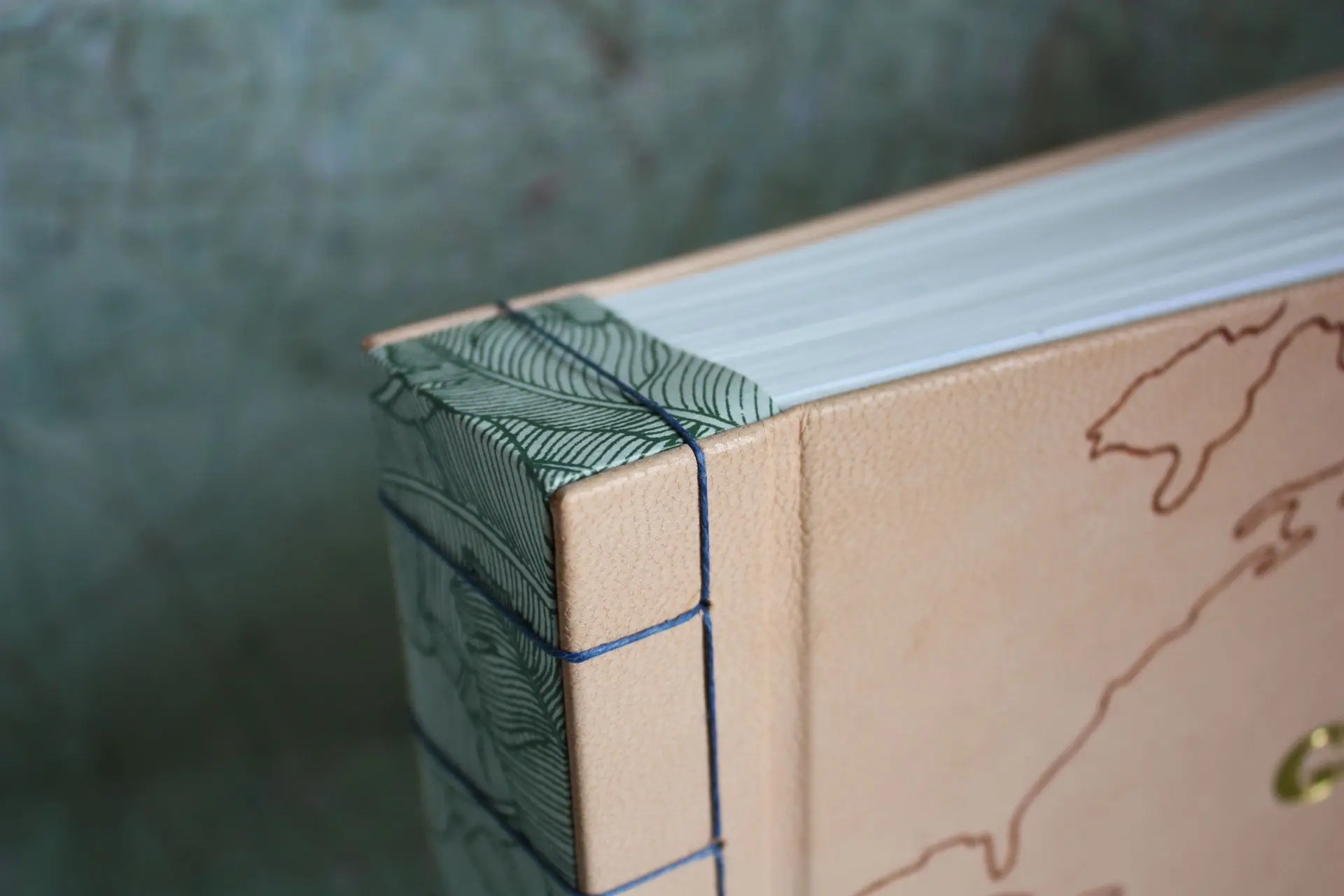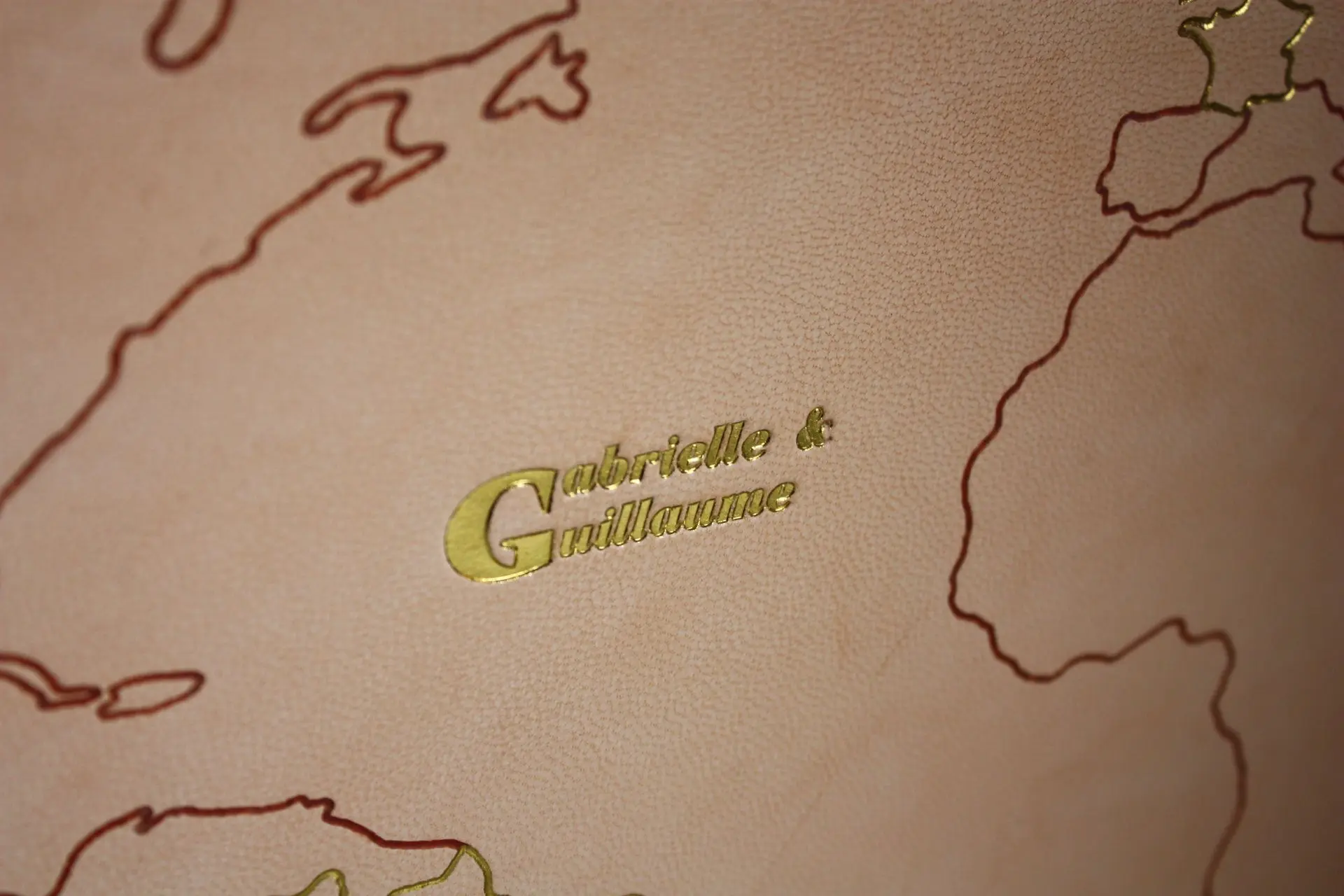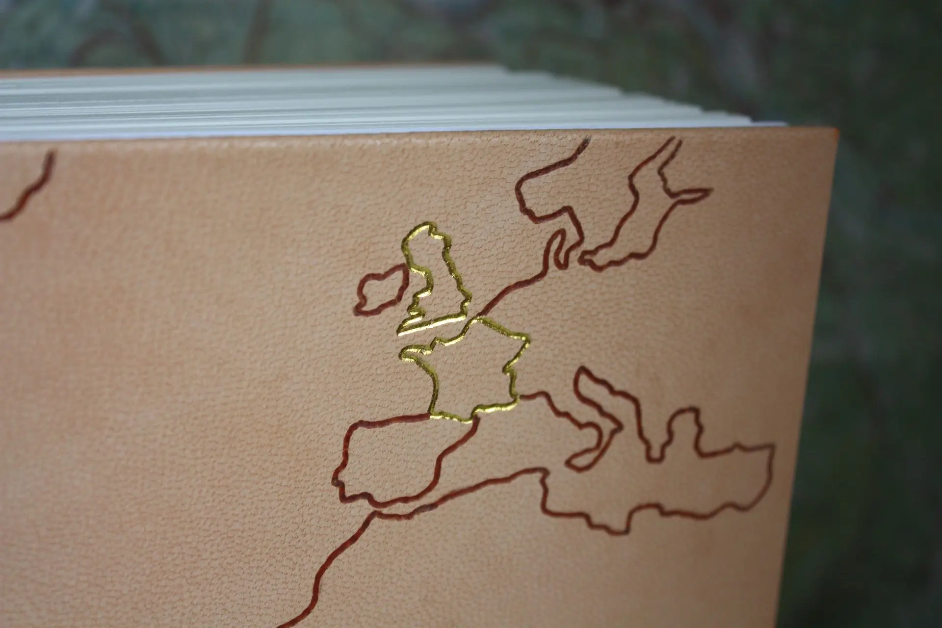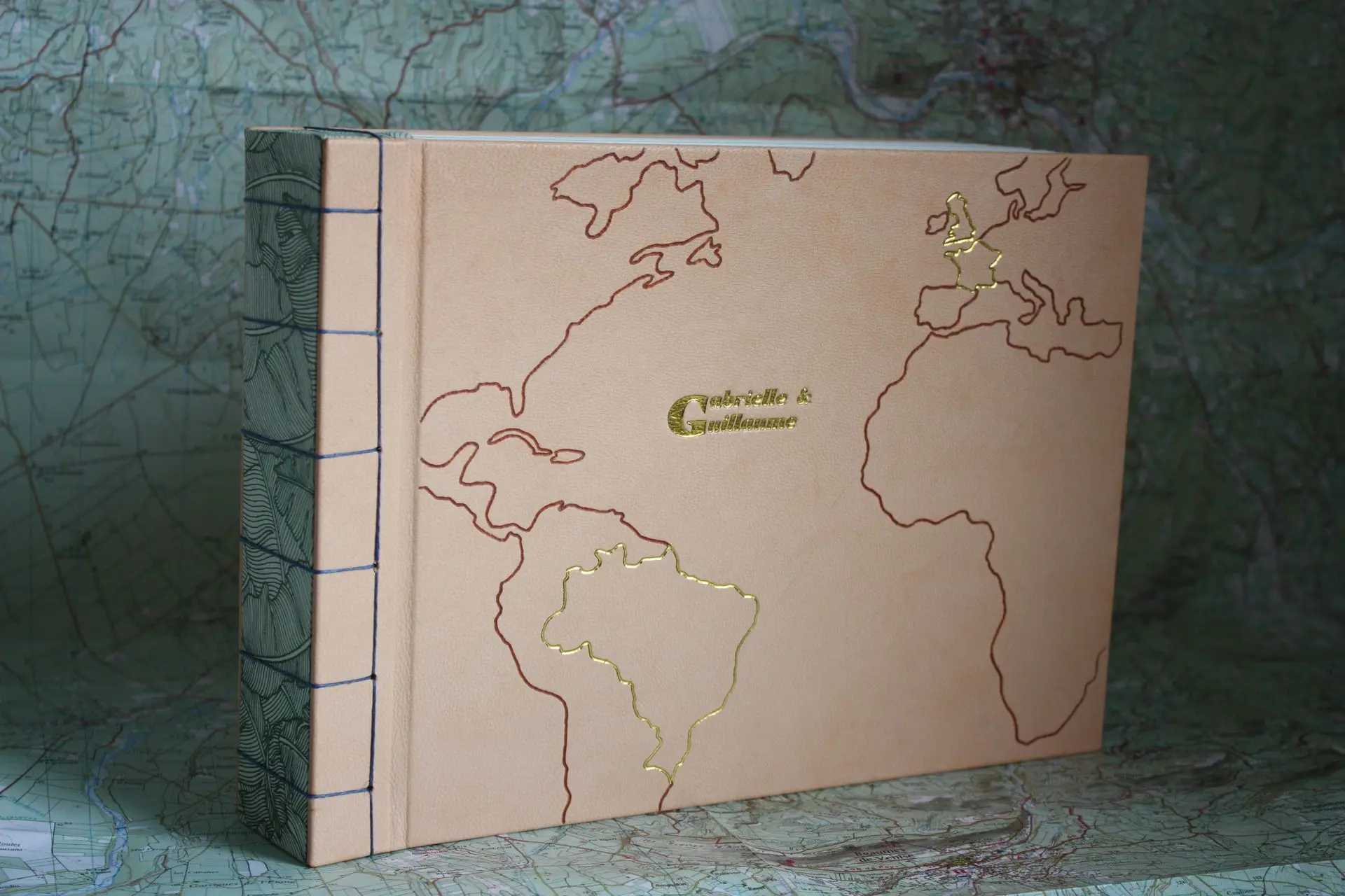 Reliure Japonaise en plein cuir de chèvre beige clair. Décor au froid naturel et dorure à chaud représentant une partie d'une mappemonde, France, Angleterre et Brésil rehaussés de doré. Texte doré à chaud. Livre d'or de mariage réalisé en 2023.