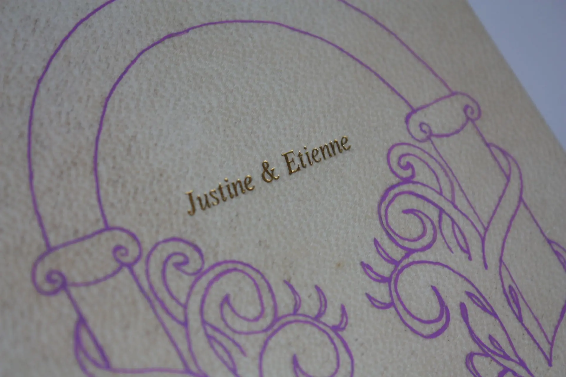 Reliure Copte en plein parchemin. Décor à l'encre mauve représentant la porte de la Moria du seigneur des Anneaux. Texte doré à chaud. Livre d'or de mariage réalisé en 2025.